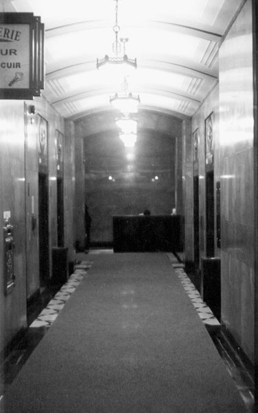 À l'intérieur des édifices, tout reluit; le bronze des portes brille comme de l'or, dans les corridors, les planchers de marbre sont partiellement recouverts de tapis épais et moelleux pour amortir le bruit des pas. Des immenses lustres suspendus aux plafonds éclairent les salles avec éclat et les meubles, les comptoirs, les boiseries de bois noble complètent le décor. Heureusement, la présence de quelques "robineux"(1) qui quêtaient humblement aux abords de la Place d'Armes et à la sortie du restaurant Cordner's nous ramenait sur terre. "Mon bon monsieur, vous n'auriez pas un p'tit cinq cennes pour une tasse de café?" On était loin du : «T'aurais pas un deux stie...» des "punks" et des "sqeegees" qui quêtent d'une manière plus insistante de nos jours. Ce jour-là, notre visite a débuté au Aldred Building situé au 507 Pace-d'Armes. Sur le tabeau à l'entrée du building, nous avons repéré un nom de compagnie et le chiffre de l'étage puis nous nous sommes présentés devant la préposée à l'ascenseur.