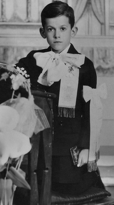 En faisant nos courses, nous avons croisé une voisine. Elle m'a pris dans ses bras en disant à ma mère : «Pauv' p'tit trésor! Si y avait pas les oreilles comme des portes de granges, y s'rait t'y beau le p'tit vinguienne.4» Offusquée, ma mère m'a ramené sur le trottoir en disant : «Vite, vite, on est pressés... s'cusez-nous m'amme chose.» Et en aparté, elle m'a dit : «Est t'y folle... non mais est t'y folle... y sont correctes tes oreilles» et pour me faire oublier l'incident, nous sommes entrés au "United 5¢, 10¢, 15¢"5 pour se payer un bon sundae au caramel et un "Coke à la fontaine"6. Ceux et celles qui nous avaient préparés pour ce grand jour nous avaient mis ça tellement beau et tellement plein de mystère que je m'attendais presque, au moment de la Communion, de voir le bon dieu me prendre dans ses bras et me serrer sur son coeur... Il n'y a rien eu de tel. Pas le moindre mystère. Tout le monde était trop absorbé par le rituel. La maîtresse épiait le moindre de nos gestes; il fallait que chacun garde son rang; qu'il surveille la distance (deux tuiles noires sur le plancher) derrrière celui qui le précède, qu'il garde les mains jointes, sans se gratter le nez, éternuer, tousser ou chercher ses parents dans la foule. C'était un "trip"7 d'adultes. Heureusement, après la cérémonie, une fête nous attendait à la maison avec des tas de cadeaux. Drôles de cadeaux à donner à des p'tits gars... des chapelets, des images saintes, des livres de messe, des crucifix, des statues de la Vierge, etc. qui allaient, le jour même, rejoindre ceux des autres enfants de la famille dans une grosse boîte au fond d'un garde-robes sur laquelle on avait écrit : «Souvenirs de Première Communion». Heureusement, il y avait aussi un gâteau; un immense gâteau blanc avec un petit bonhomme habillée en premier communiant au milieu. Je garde surtout de ce grand jour le souvenir ému de la petite fille qui marchait à côté de moi dans le rang. Deux petites mêches de cheveux sortaient sous son voile; elle avait des belles joues roses et des jolis yeux légèrement bridés qui donnaient à son regard un charme particulier. Quand nous marchions côte-à-côte durant les exercices, sans me faire remarquer par la maîtresse, je lui prenais la main l'espace d'une seconde. Toute gênée, elle se tournait vers moi en souriant. Un jour, elle m'a glissé dans la main un petit bout de papier sur lequel elle avait dessiné un coeur avec son nom écrit dedans. Elle s'appelait Violette... et je l'aime encore... 1