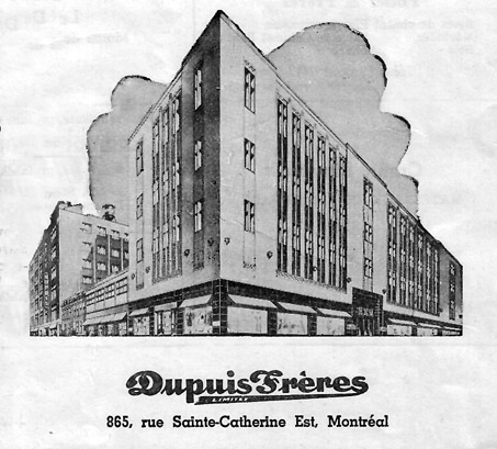 entreprises paternalistes à Montréal, À l'occasion de je ne sais trop quel anniversaire, les employés, qui gagnaient des salaires minables, s'étaient cotisés pour offrir à la richissime famille Dupuis un luxueux "abreuvoir" (on dirait aujourd'hui une fontaine) à l'usage de sa distinguée clientèle. Située près des ascenseurs, cette fontaine portait une dédicace gravée dans le marbre à la gloire de la Sainte Famille Dupuis. En plus d'être le magasin préféré des petits bourgeois et de l'élite canadienne-française, Dupuis &Frères était à peu de choses près le fournisseur exclusif du clergé sur le territoire du Grand Montréal. Prêtres séculiers, pères, sœurs et frères économes de la plupart des congrégations religieuses venaient s'approvisionner chez Dupuis où ils étaient reçus avec tous les égards que leur rang commandait. Dans les autres rayons, les petits bourgeois qui bénéficiaient d'un compte courant avaient droit à presque autant d'égards. Les courbettes et les "plairait-il à madame..." étaient monnaie courante. Députés et échevins étaient reçus comme des princes . Imaginez l'immense scandale quand, le 2 mai 1952, peu de temps après l'horrible grève de l'amiante, qui avait chassé Monseigneur Charbonneau du diocèse de Montréal, les employés de la très sainte maison Dupuis &Frères décidèrent de faire la grève. Quels ingrats... Le vote de grève était nettement majoritaire, le syndicat avait respecté toutes les lois du travail, les revendications étaient des plus légitimes mais la Sainte Famille Dupuis, appuyée par le gouvernement, les petits bourgeois et l'élite canadienne-française, décida d'avoir recours à des briseurs de grève et de garder le magasin ouvert. Au début, la clientèle hésitait à franchir les lignes de piquetage mais petit à petit, attirée par les réclames à bas prix offertes par le magasin, l'achalandage retrouvait son niveau normal. Le syndicat des employés de Dupuis &Frères affilié à la Confédération des travailleurs catholiques canadiens (C.T.C.C. l'ancêtre de la CSN) fut forcé de réagir et d'augmenter la pression sur les scabs. La sortie des employés à la fin de leur journée de travail devint de plus en plus pénible et la famille Dupuis dût louer des autobus pour les ramener chez-eux. À cette époque, je travaillais pour les grossistes Greenshield Hogson Racine sur la rue Saint-Paul.